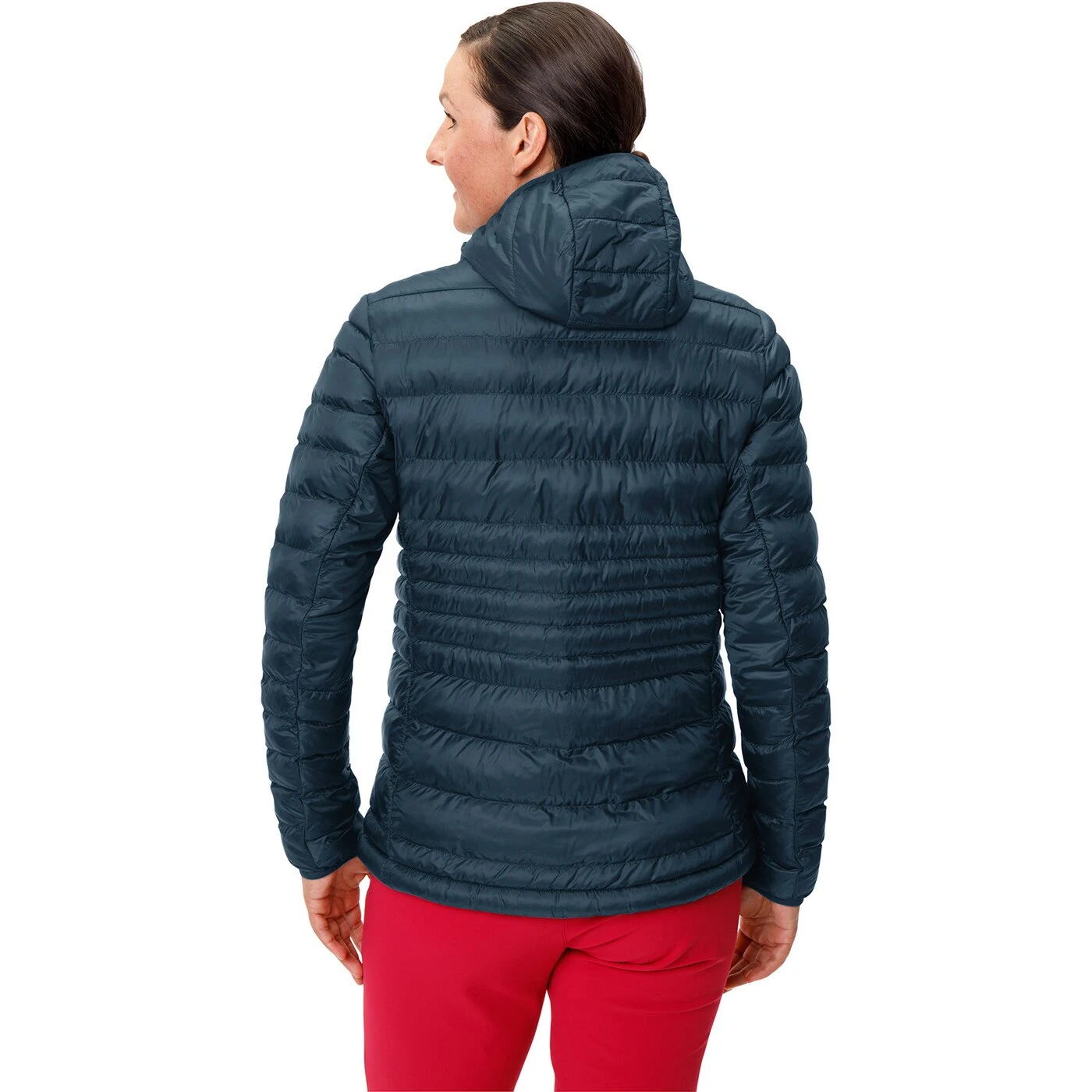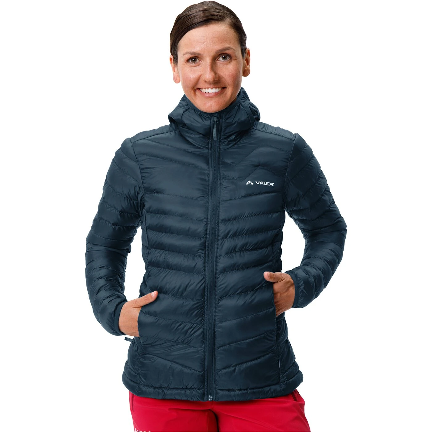 - Sehr leichte Damen Isolationsjacke mit Kapuze für den Bergsport, sehr warm, in der Innentasche verstaubar, klimaneutral kompensiert; vollständig aus recyceltem Material hergestellt