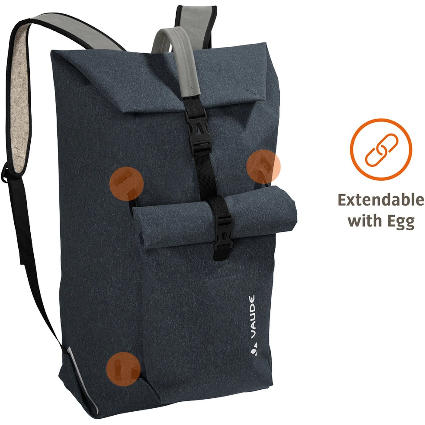 Klassischer Look aus modernsten, nachhaltigen Materialien: der Wolfegg. Ein Rucksack mit ordentlichen 24 l Volumen in sorgfältiger Verarbeitung, Made in Germany. Die ergonomisch geformten Schulterträger wurden aus einer Kombination aus nachhaltigem terracare® Leder und natürlichem Stoff aus Hanf und Baumwolle erstellt. Der Packsack selbst besteht aus einem robusten, wasserdichten und schmutzabweisenden Material in textiler Optik, hat dekoraktive reflektierende Aufdrucke und einen Deckelgriff. An den raffinierten Ausstanzungen auf der Vorderseite kann Zusätzliches befestigt werden – wie z. B. Blinkies oder kleine Karabiner. Dieser Rucksack hat es aber auch in sich: im großen Hauptfach befindet sich ein herausnehmbarer, wattierter Organizer, in dem Tablet, Stifte und Unterlagen übersichtlich und sicher geschützt verwahrt sind – auch wenn der Wolfegg nach Feierabend noch für den Wochenendeinkauf herhalten muss. Das Laptop (bis 15.6″) findet im separaten Laptopfach Platz und auch der Schlüssel ist durch den leicht erreichbaren Schlüsselhalter immer griffbereit. Handy und Geldbeutel sind im seitlichen Reißverschlussfach schnell gefunden. Das VAUDE Green Shape-Label steht für ein umweltfreundliches, funktionelles Produkt aus nachhaltigen Materialien. Ein kleines Meisterstück aus unserer VAUDE Manufaktur, das seinem Besitzer viele Jahre lang ein Lächeln ins Gesicht zaubern wird.